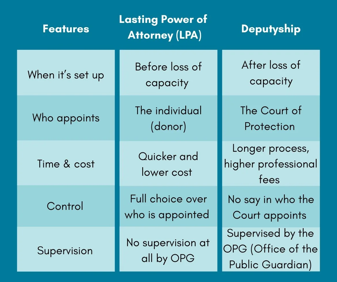 Key differences between Lasting Power of Attorney (LPA) and Deputyship